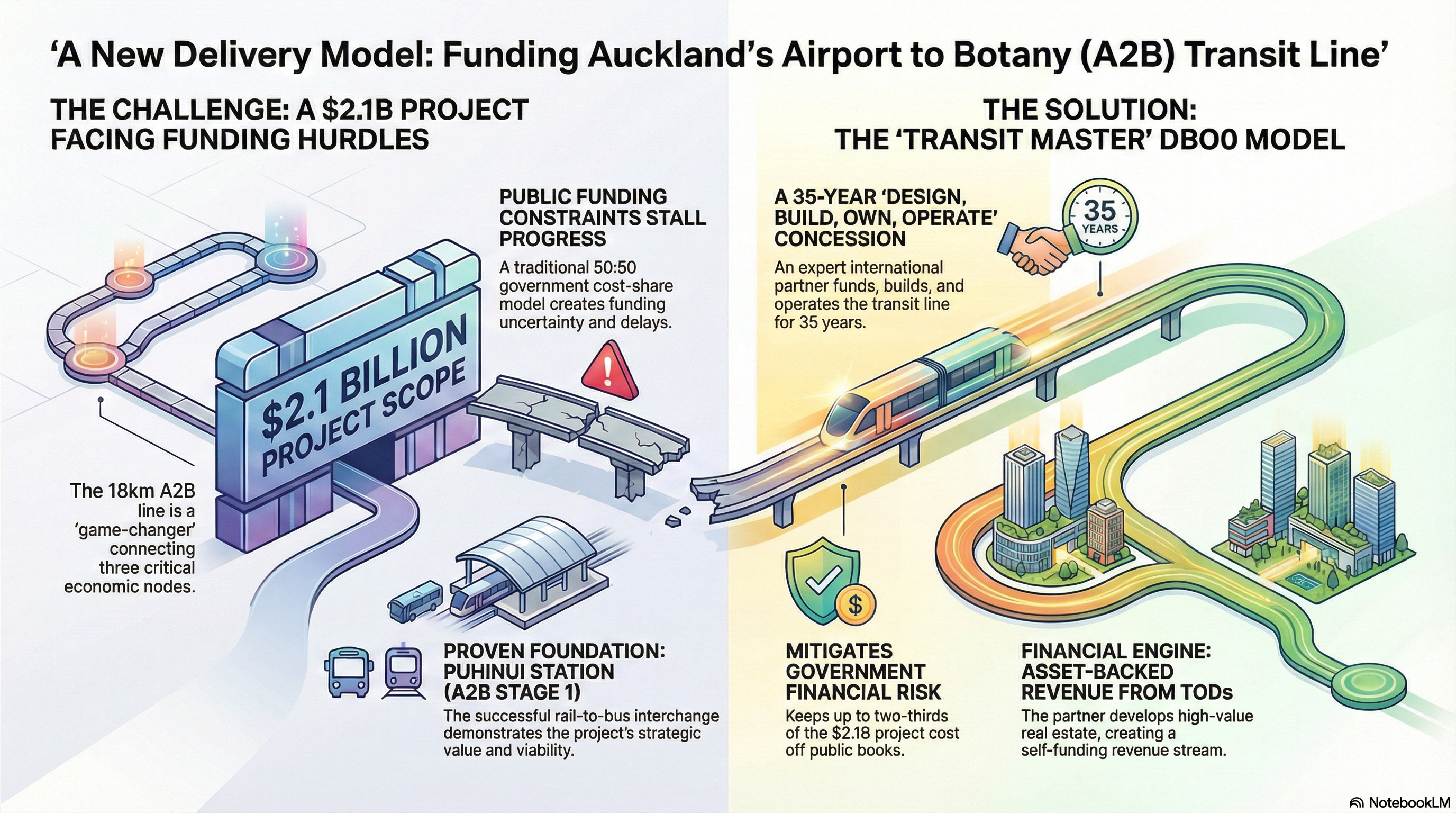 | Design, Build, Own, and Operate (DBOO) Concession | To accelerate the delivery of major transit infrastructure by engaging international expertise and bypassing local funding constraints. | Engaging ‘Transit Masters’ (e.g., from Singapore or Hong Kong) to construct and operate the A2B line in exchange for a 35-year concession and TOD development rights. | Keeping half to two-thirds of the estimated $2.1 billion project cost off public balance sheets while delivering world-class transit. | Public-Private Partnership with TOD real estate as an asset-backed revenue stream for the private partner. | Airport to Botany (A2B) Rapid Transit line. | 1, 3, 4 |