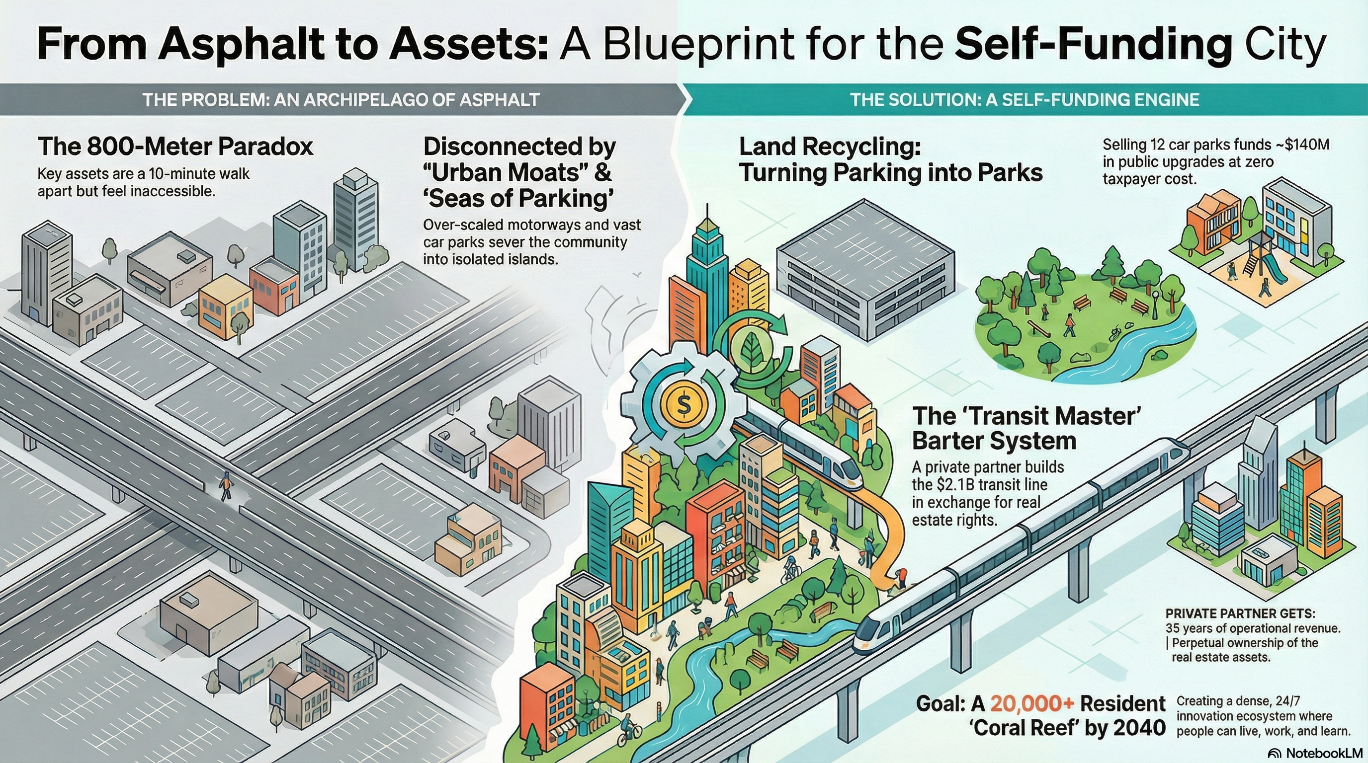 | Land Recycling | To fund urban regeneration projects at no direct cost to ratepayers by converting low-value asphalt into high-value capital. | The strategic sale and redevelopment of underutilized council-owned land, primarily surface car parks like those at 14 Davies Avenue or Westfield Mall. | Generating approximately $140 million in revenue to be reinvested into public realm upgrades like parks and streetscapes. | Self-funding model through the sale of underutilized public assets. | Surface parking lots; Public realm assets (parks, plazas). | 1, 3-5 |