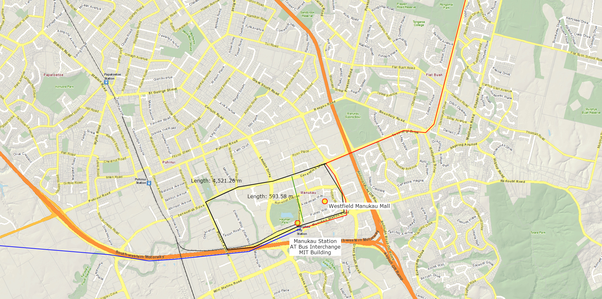 However in regards to a Sky Train line (rather than a Monorail) from the airport to Manukau then running as the basic Botany Line, it caught my attention so I decided to do some doodling on the Council GIS system.