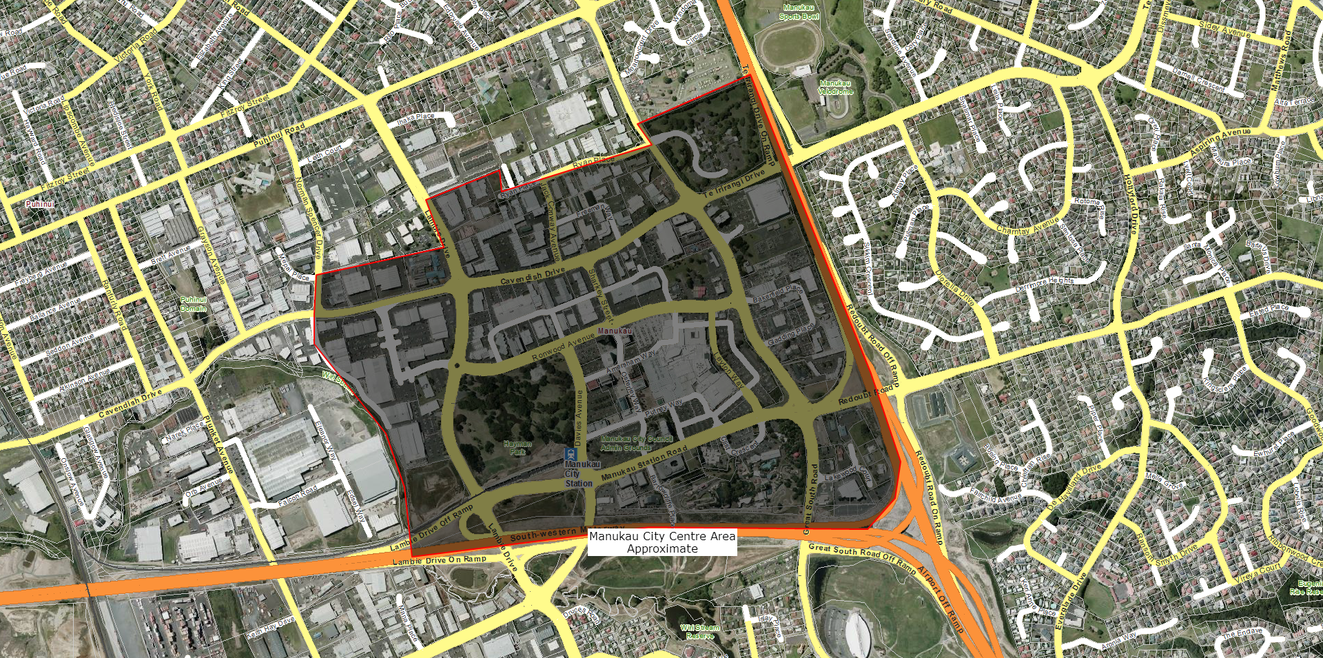 - main arterials AROUND the Manukau City Centre rather than through the middle of it (apart from Manukau Station Road on the southern flank)