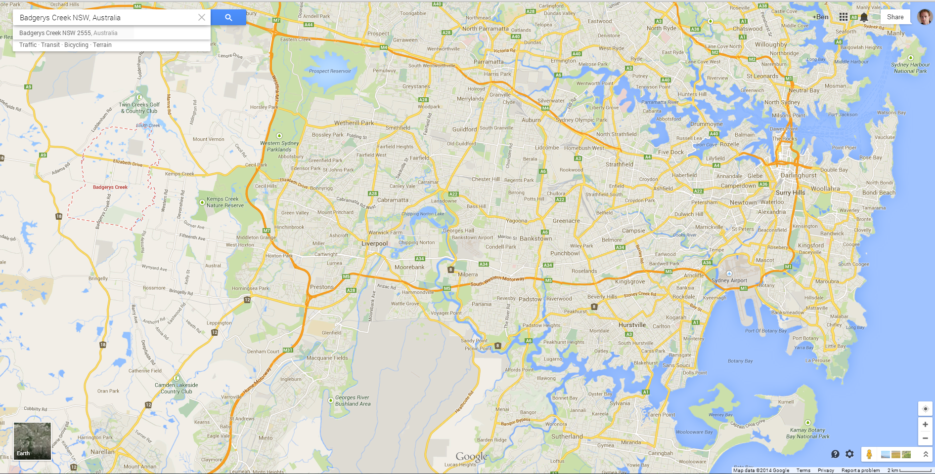The new airport is to be located at Badgerys Creek which is to the west of Sydney CBD. Here is a map of the location of the airport in comparison to Sydney: