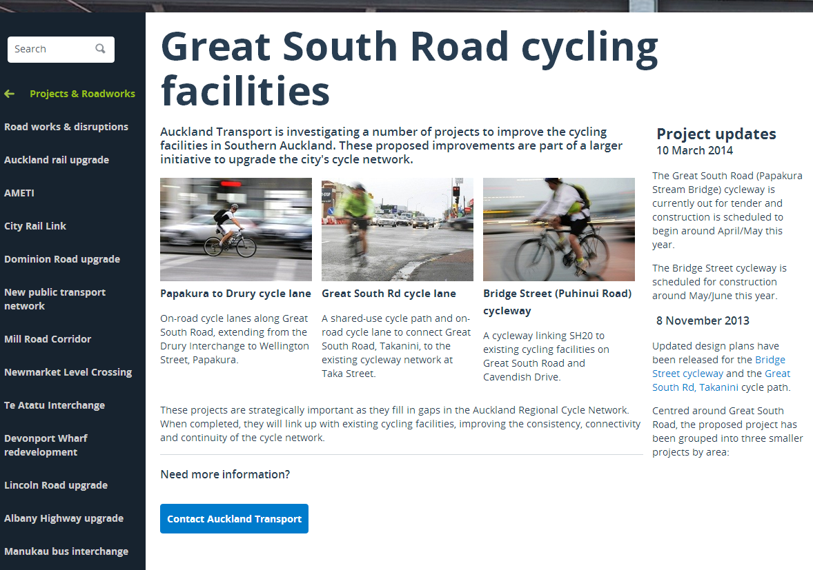 Scroll down a bit and we get to the South (Southern Auckland) Projects of which one project caught my attention, the new cycle ways coming our way down here: