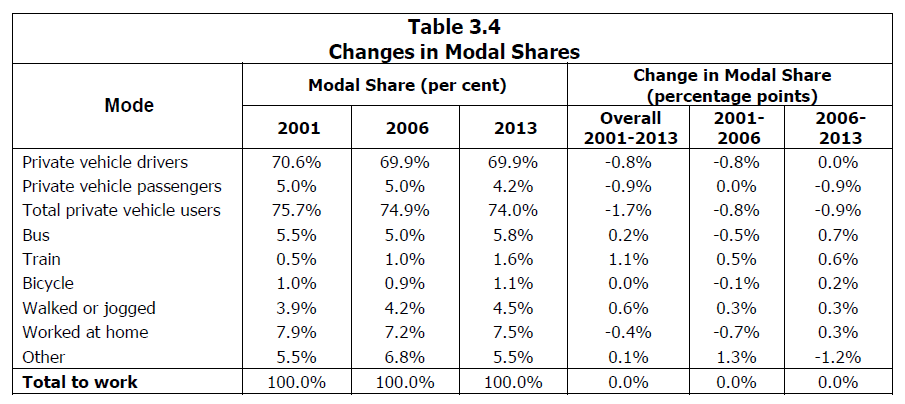 Increases in total private vehicle use accounted for about 48 per cent of the growth in commuting trips.