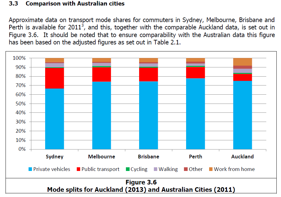 Compared to Australian cities, Auckland has a low share of public transport use, but high shares of active mode trips and of people working at home.