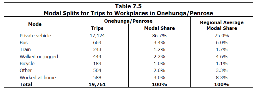 Compared to the position for the Region as a whole, Onehunga/Penrose as an employment area has a high share of private transport movements and low shares of both bus and train users, despite the reinstatement of rail services to Onehunga. There are also low shares of active mode trips although the share for bicycle is only just below the regional average.