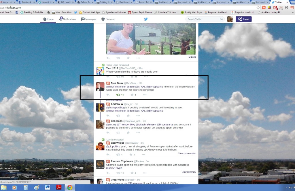 And here come the replies When Councillor Dick Quax Tweets this: @lukechristensen @BenRoss_AKL @Brycepearce no one in the entire western world uses the train for their shopping trips — … Continue reading Councillor Dick Quax Tweets