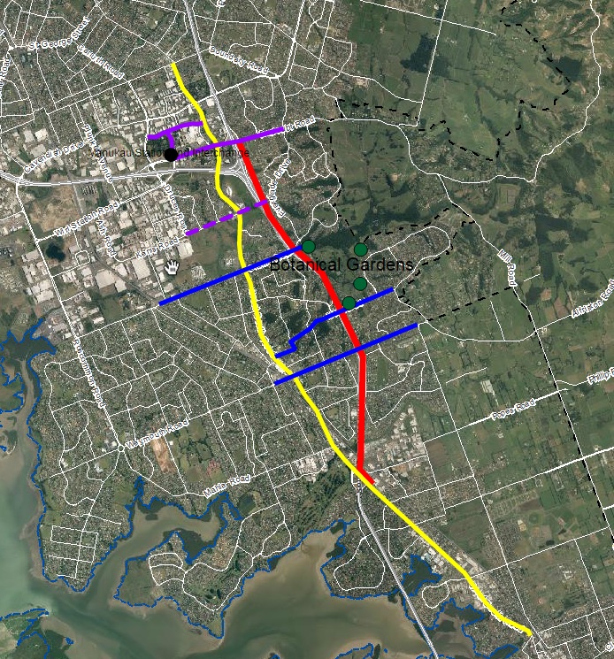 While you see the Great South Road and NZTA Motorway cycleway possibilities, I have also focused on quick win East-West cycleway links that would help connect the wider area to the main north-south cycleways (as well as the Botanical Gardens).