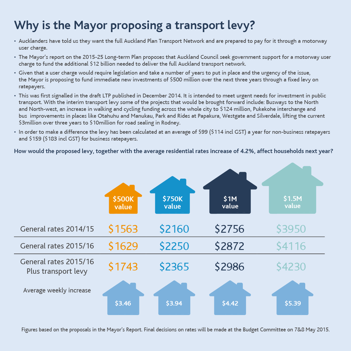 The Mayor’s budget is proposing to fund immediate new investment in transport of $500 million over the next 3 years with an interim fixed levy of $2 per week on Aucklanders.