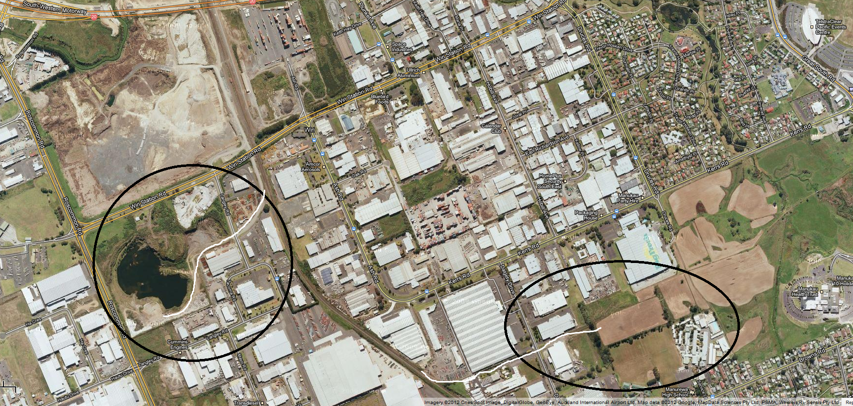 Here is a closer up shot of the possible relocation site. You can see a super imposed line where the outer most limits of the Semi-Liberal Planned Districts are planned to go as part of the 60:40 Brownfield:Greenfield expansion of Auckland (as per my submission to the Draft Auckland Plan). As you can see, further expansion to the port site along the Papakura-Clevedon Road corridor would not be too difficult to do in theory.
