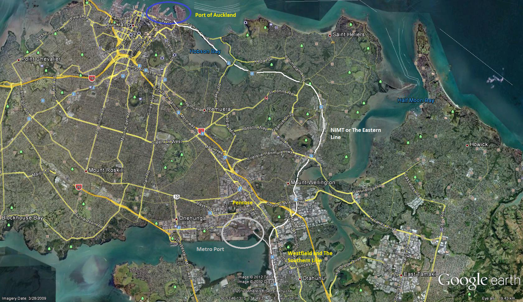 You can see that POAL is pretty isolated from its support bases in both Wiri and Penrose/Westfield. Trucks and freight trains have to traverse some of the most congested routes in Auckland to move their goods to or from the Port back or from their inland bases before the goods are either further moved by train or truck to their final destinations and their customers. If you a truck – you also have to traverse the steep Grafton Gully and get stuck in the Newmarket Viaduct on the way out. As Cayford blogged, congestion is time – and time is money to businesses, exporters and importers; and heck you see some congestion between Wiri and Port of Auckland both on the roads and railway (passenger train movements). So the question is, if we (Auckland) have congestion now fouling freight movements between POAL and the inland operation points at Penrose/Westfield or Wiri, then I hate to think of the fouling and economic inefficiencies come 2040 when there two million people and a port moving double the volume of goods now.