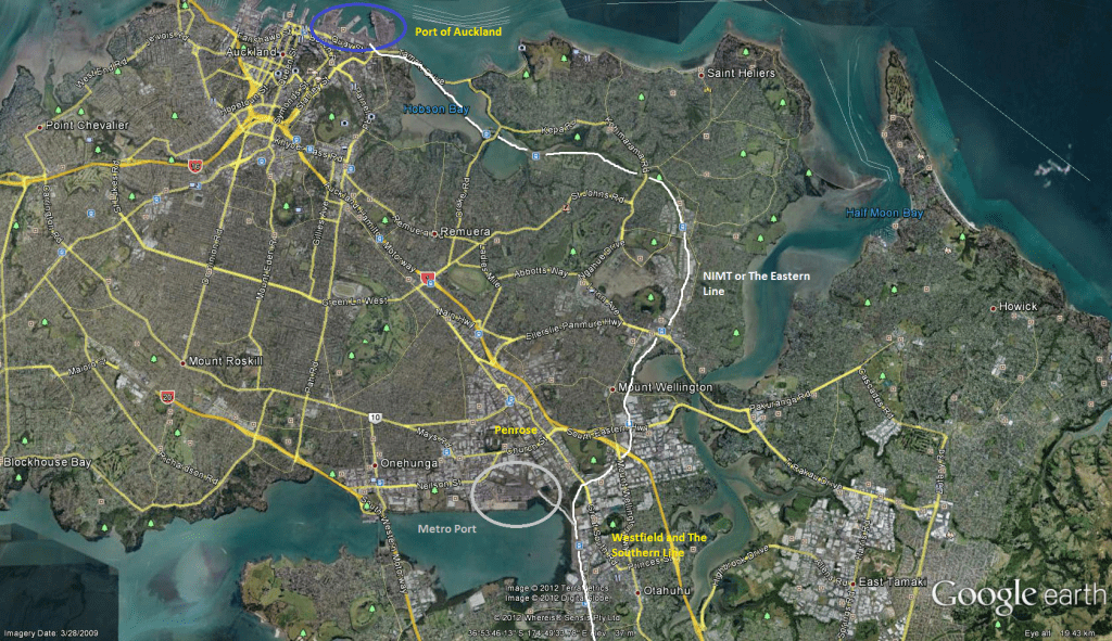 Simply put there are two ways in and out of Port of Auckland to get freight over land to and from where ever it needs to go. The first being (as mentioned above) the North Island Main Trunk Line – or for train commuters The Eastern Line from the Port (opposite The Strand near Britomart) to Westfield Junction, before the NIMT carries on from Westfield Junction south on the Southern Line. The second route being State Highway One (The Southern Motorway) via Grafton Gully and Stanley Street (State Highway 16) from the Port to (usually) the South Eastern Highway or Mt Wellington Highway. Now the reason why I mention Westfield Junction and the South Eastern or Mt Wellington Highways is because, these two links serve the major logistics freight hub and an inter-modal base in Auckland – which are in the suburbs of; Penrose, Mt Wellington and Westfield. However there is another freight logistics hub in Wiri further south which sits right on the Southern Line. This “inland” port is also an inter-modal base for containers to be transferred to and from trucks to/from rail – the same as Metro Port in Penrose.