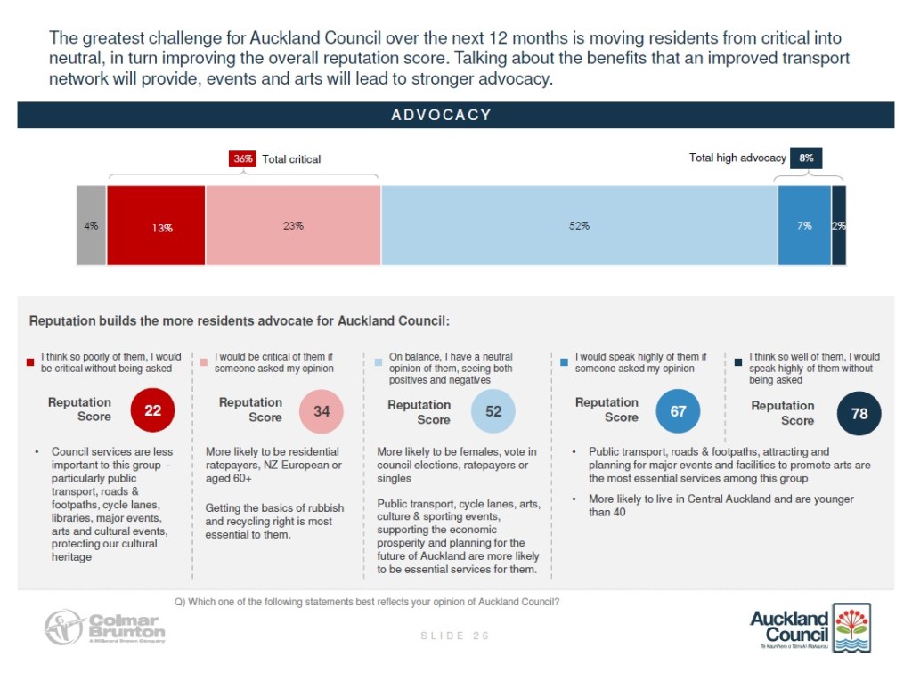 In any case my advice would be to those seeking election to read the electorate very carefully and by electorate I mean ALL of Auckland. The reputation score and demographic breakdown of that reputation score show quite different to what the 6-second soundbytes showed that were in reaction to the presser. That being an electorate looking for improvement rather than change.