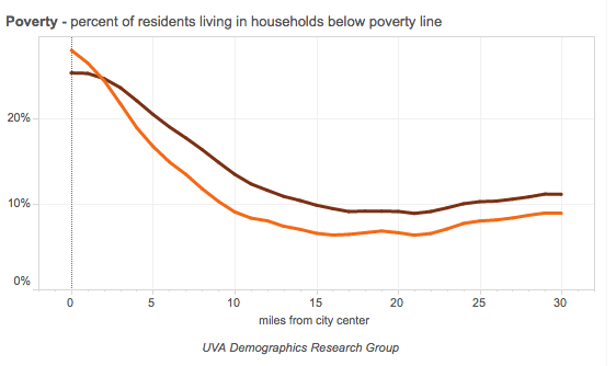 In the 22 years between 1990 and 2012, the central city poverty rate (1 mile from the center of the CBD) declined from 26 percent to 25 percent, while the poverty rate 20 miles away in the suburbs increased from 7 percent to 9 percent. Poverty in the center was on average 15 percentage points higher in the center than in the periphery. The gap between the two areas thus closed by 3 percentage points. At 1.5 percentage points per decade, it would take until the end of the century before poverty levels equalized between the urban core and twenty miles out.