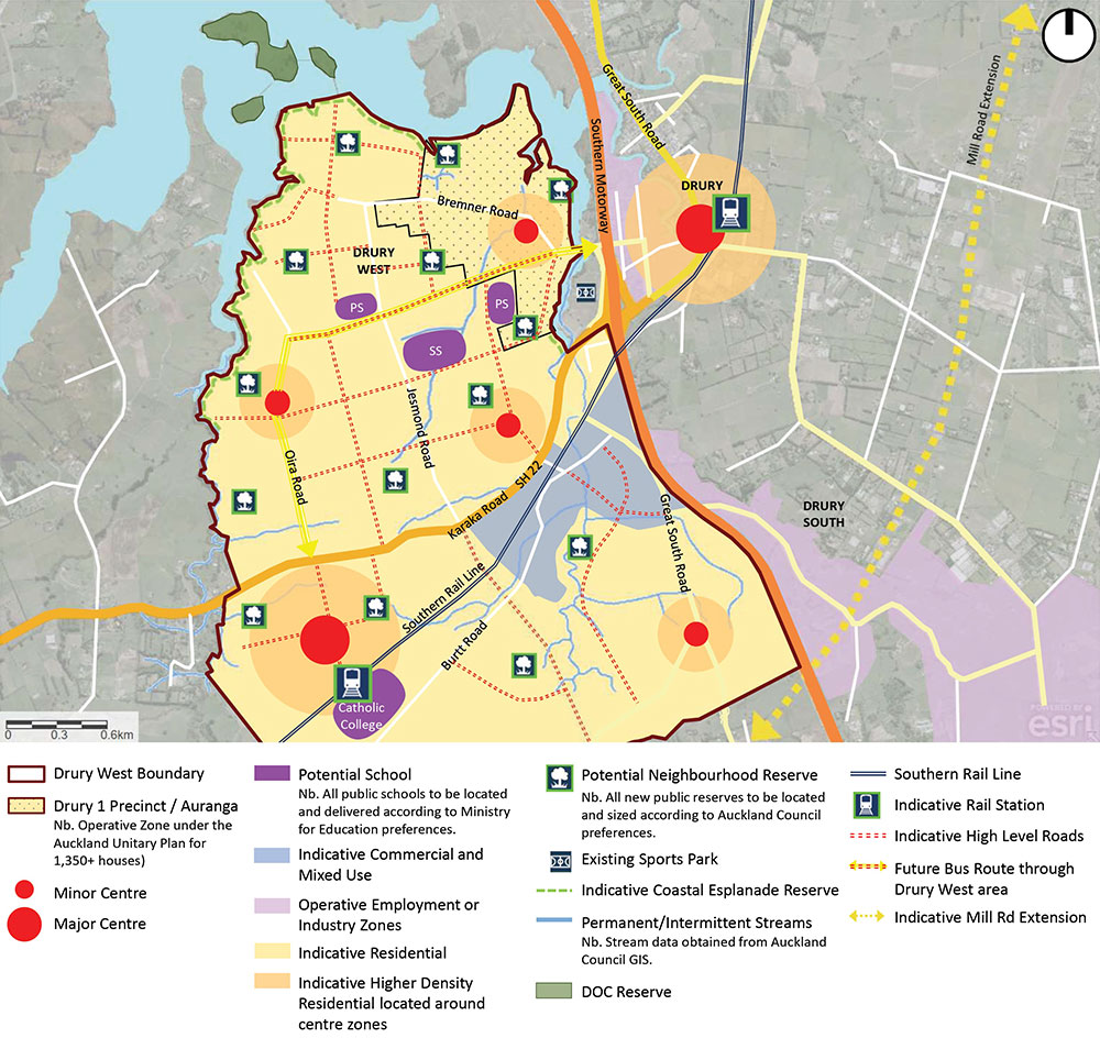- A major centre e.g. a large town or even metropolitan centre to the east of SH1 close to the existing industrial area and Drury Village. People living in Drury West would travel longer distances and cross the State Highway to access most retail and service needs.