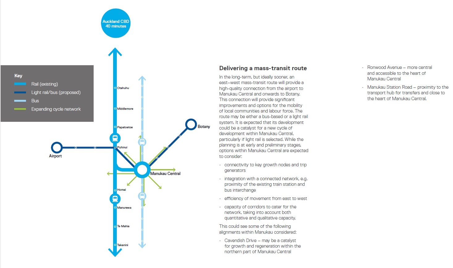 An integral part of the strategy is a new Rapid Transit connection between Howick-Botany-Manukau-Airport/Airport Employment area. The likely passenger demand and available route suggest that Bus Rapid Transit is the most appropriate system for this route immediately, with the potential for an upgrade to Light Rail in the future once ridership grows. The route, however, would be future proofed fully for Light Rail, and if extra funding came available for Light Rail, or the need became apparent we would be completely open to Light Rail.