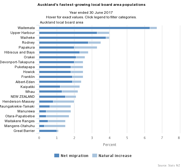 The Auckland region grew 2.6 percent (42,700) in the year ended June 2017, with 6 of its 21 local board areas increasing by more than this, Stats NZ said today.