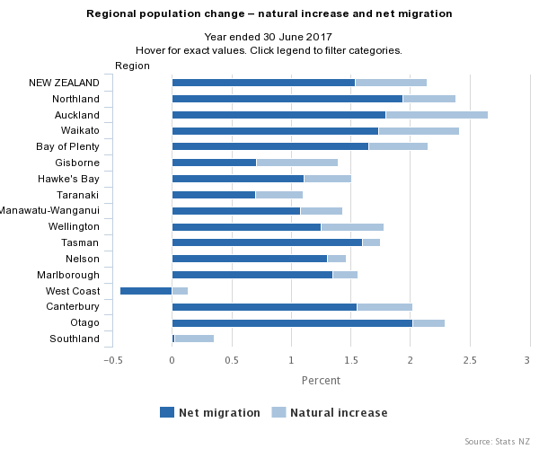 In the June 2017 year, the West Coast was the only region with a declining population. Its population fell from 33,100 in 2012 to 32,500 in 2016, and decreased further to 32,400 in 2017. This was due to departures exceeding the combined gains from arrivals and natural increase (births less deaths).
