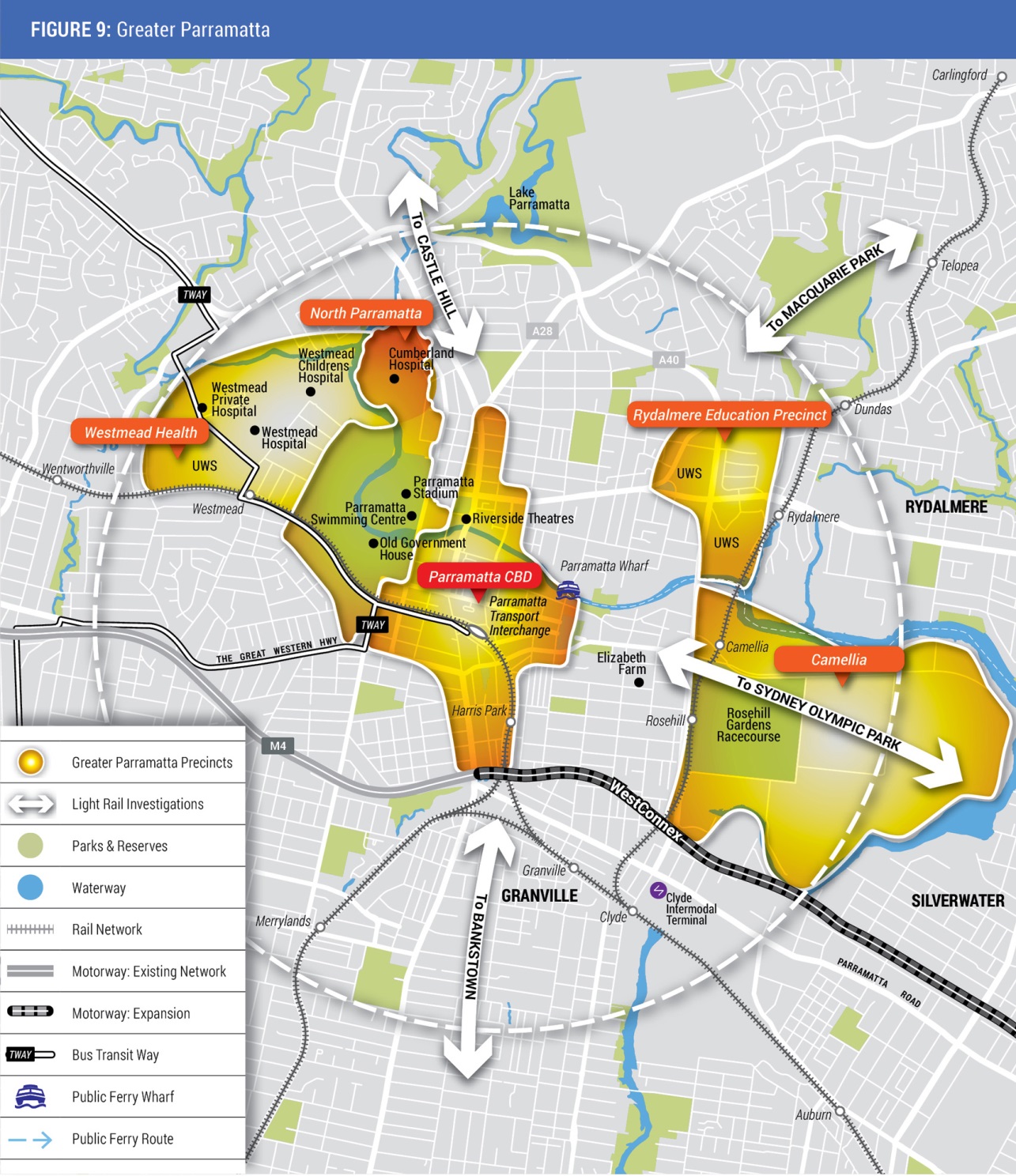 - grow Greater Parramatta by connecting and integrating the precincts which provide jobs, goods and services including Parramatta CBD, Westmead, Rydalmere, Parramatta North and Camellia with the existing commercial core.