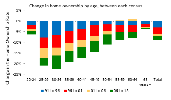 - 2013 Census data also shows that the largest decline in homeownership was among adults under 40. Half of whom owned their own home in 1991, compared to a quarter in 2013.