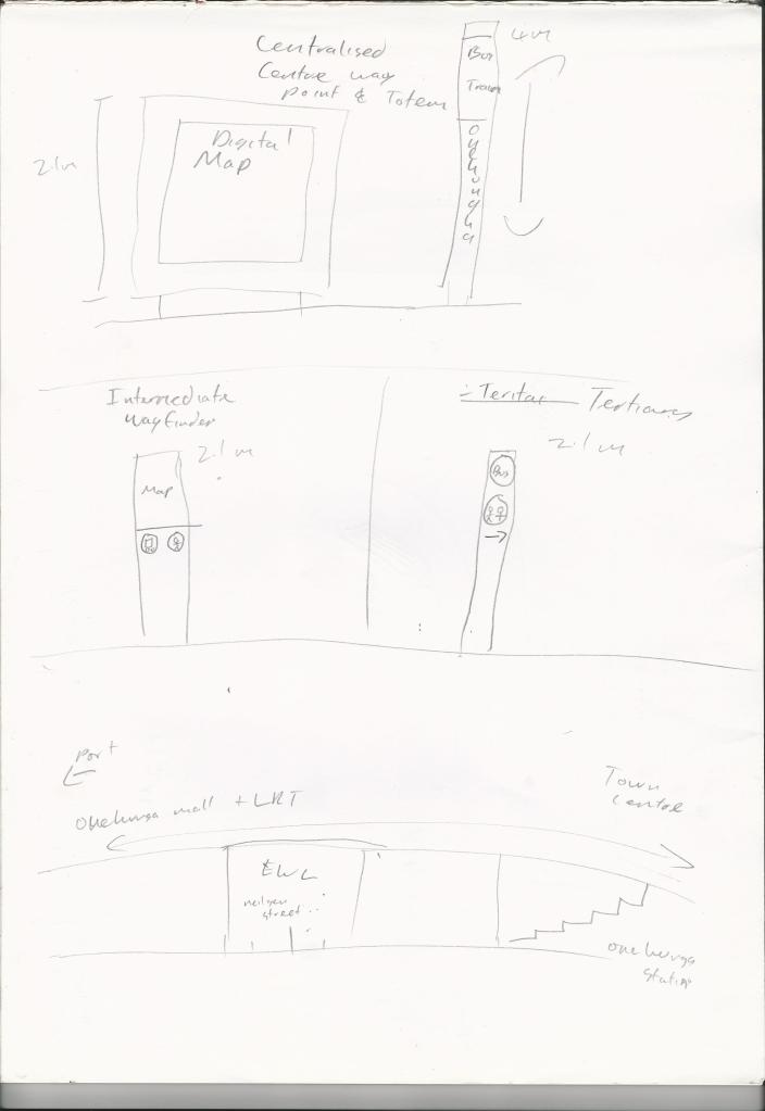 2.1m high totem posts that include basic maps and key destination indicators such as public toilets, busses, police or anchor point (say a mall). These Way-finding posts have two uses: