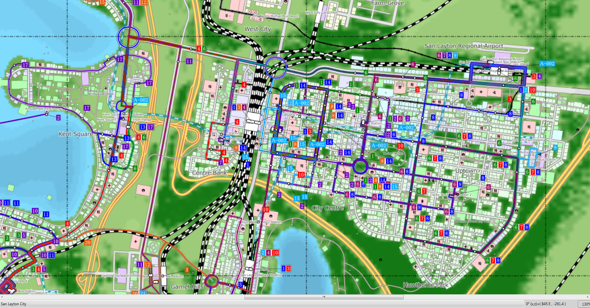 This time we zoom into the City with the City Centre, Uptown, Centre Park and Central Station as the focus points. I disabled the Forest mode so the Green does not show up in this map. What the map does not show either is when I have placed heavy rail underground. With San Layton City the main freight line goes underneath the City Centre and Central Station allowing a link between West City and Farm Cove to the Inland Port further down the map.