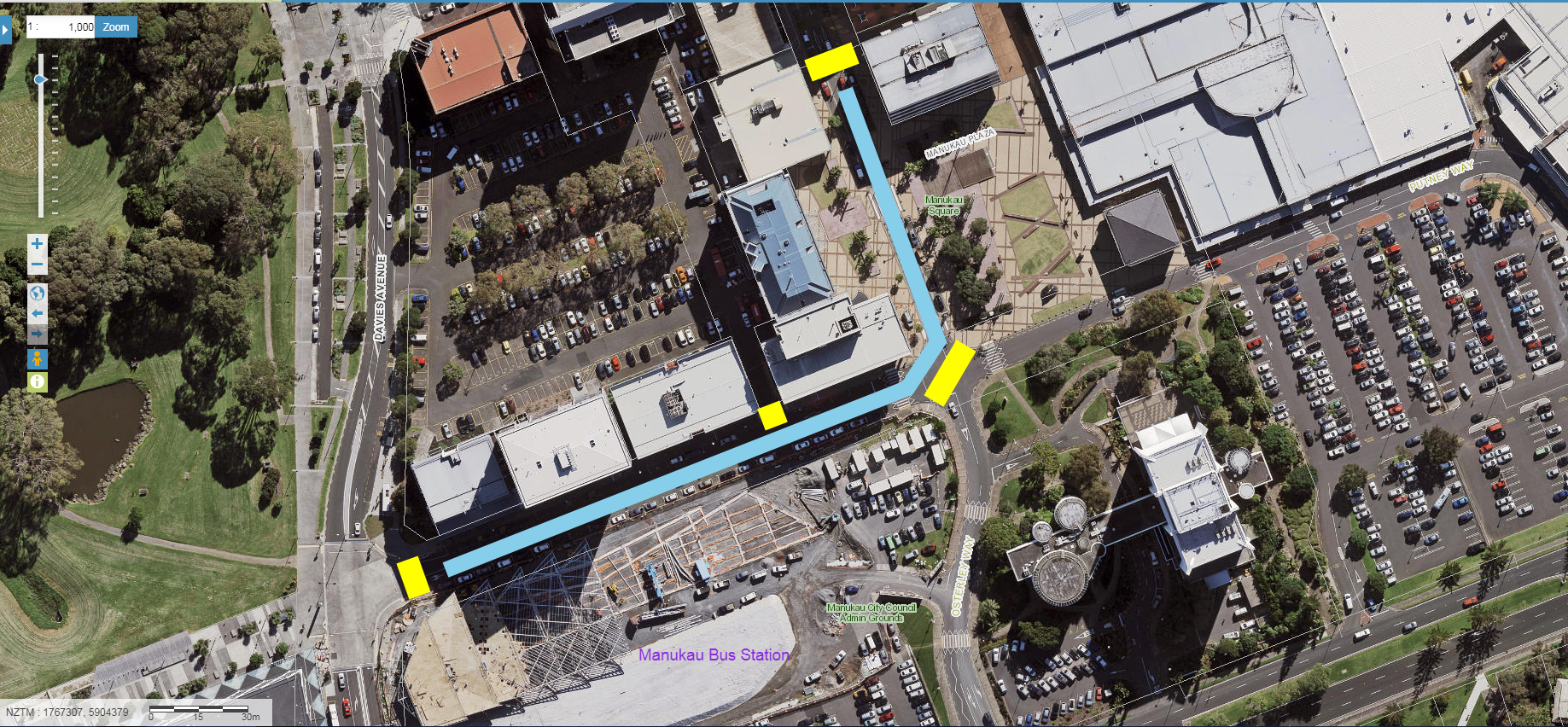 That said the Putney Way section closed off could become a transit mall to cater for the 33 and 361 busses that run through Manukau and not stop inside the station themselves. This would free Davis Avenue up for the taxis.