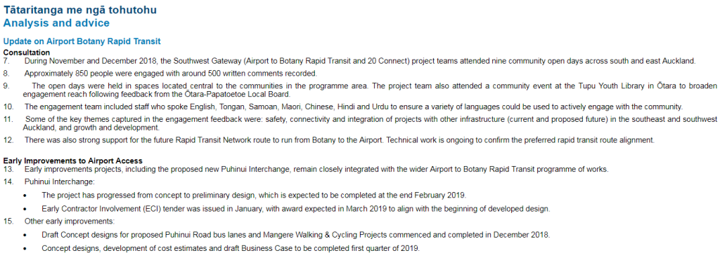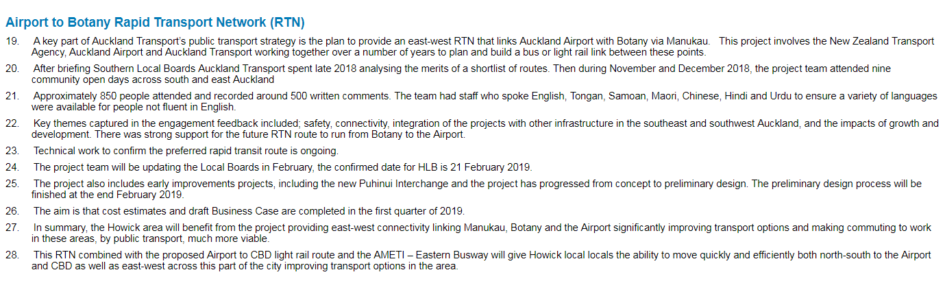 2019 means time for updates, starting with Airport to Botany Rapid Transit. With the Local Boards resuming their monthly business meetings, I also resume surfing through their monthly agendas. As Howick Local Board is the first of the Southern Local Boards to meet for 2019, their agenda was the first one I surfed through.