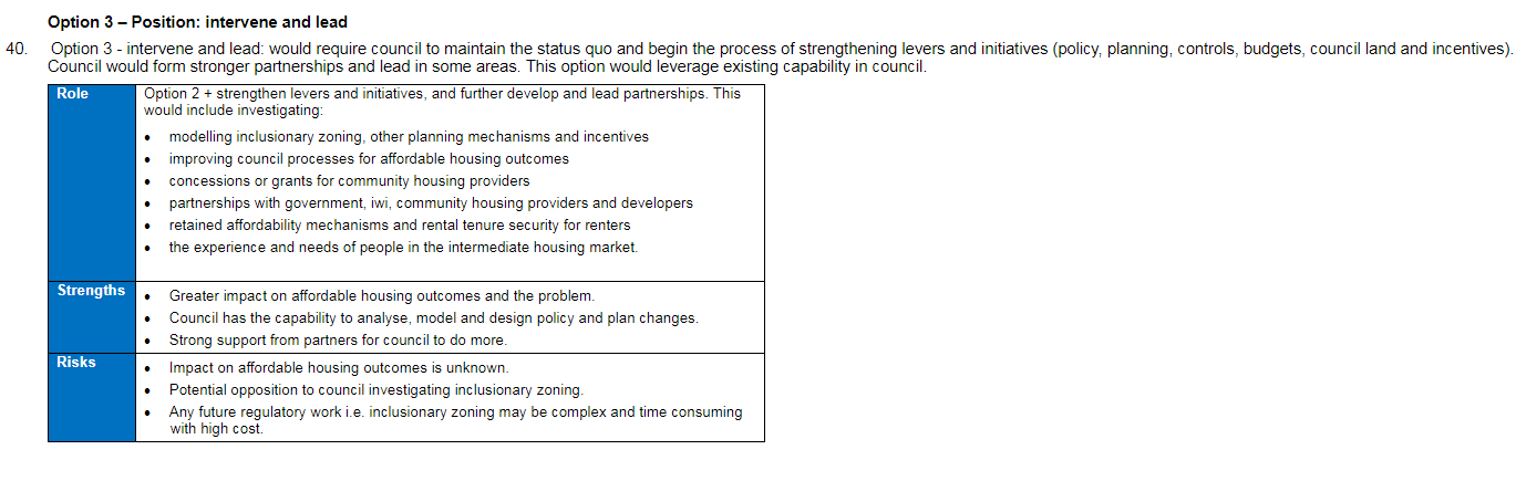 - Option 3 – intervene and lead. This is ‘doing more’ by investigating levers (e.g. inclusionary zoning) and incentives, and leading and partnering for stronger collaboration.
