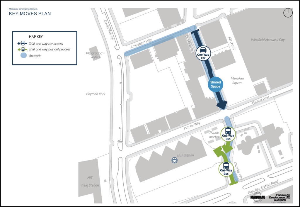 - Transport: as well as new separated cycle lanes and shared spaces part of Osterley Way (between Manukau Station Road and Putney Way) will be converted into a Busway. The purpose of the busway is to allow buses ease of access to the bus station, allow accommodation of the cycle way connecting Barrowcliffe Place and Manukau City Centre, and reduce bus lane infractions on Manukau Station Road through a more continuous bus lane.
