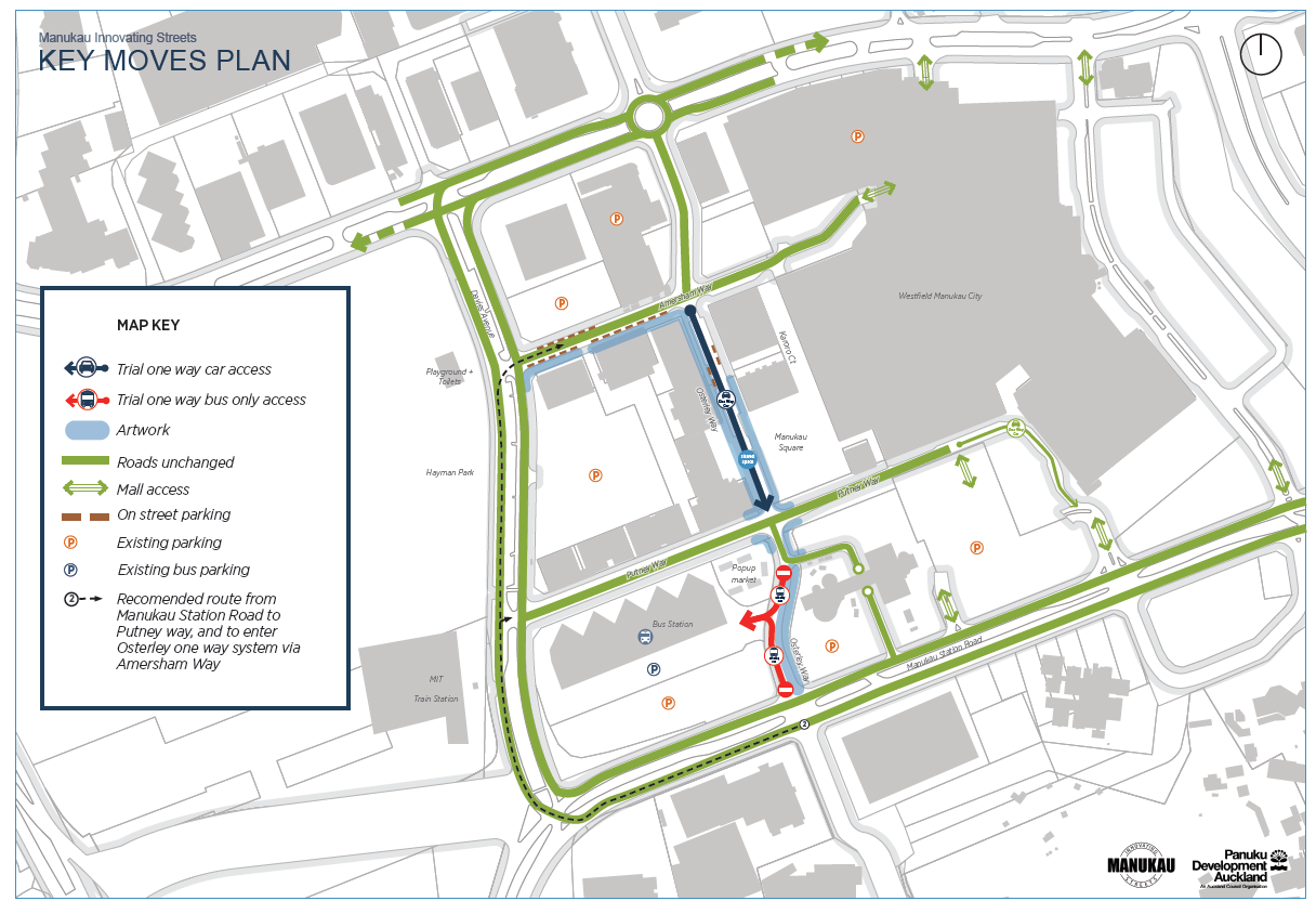 The Bus Mall is due to be rolled out in July. This will have an initial impact on traffic wishing to exit or enter Manukau Station Road to/from the core of Manukau City Centre. Davis Avenue and Ronwood Avenue will continue to be available for those wanting to access Amersham Way or Manukau Station Road. The maps below outline the alternative routes: