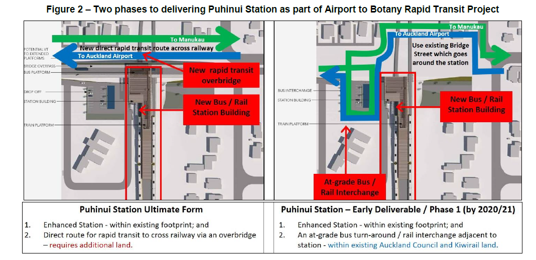 - Puhinui Station to allow transfers to the Southern and Eastern Line commuter trains, and Te Huia (Auckland to Hamilton that will evolve into full blown inter-city rail services)