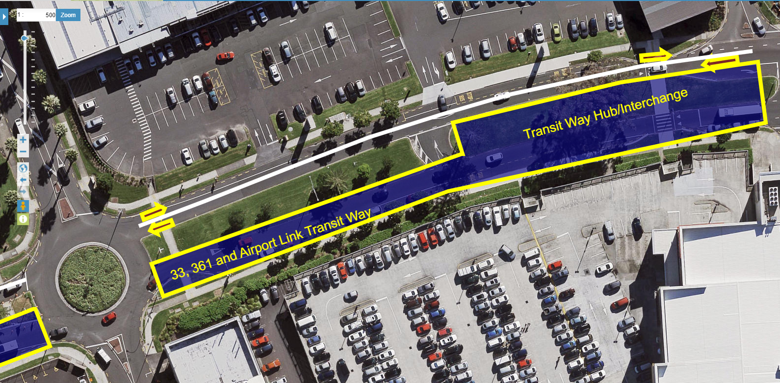 Lambie Drive with the bus lanes and floating bus stop serving the Airport Line, and 36 bus