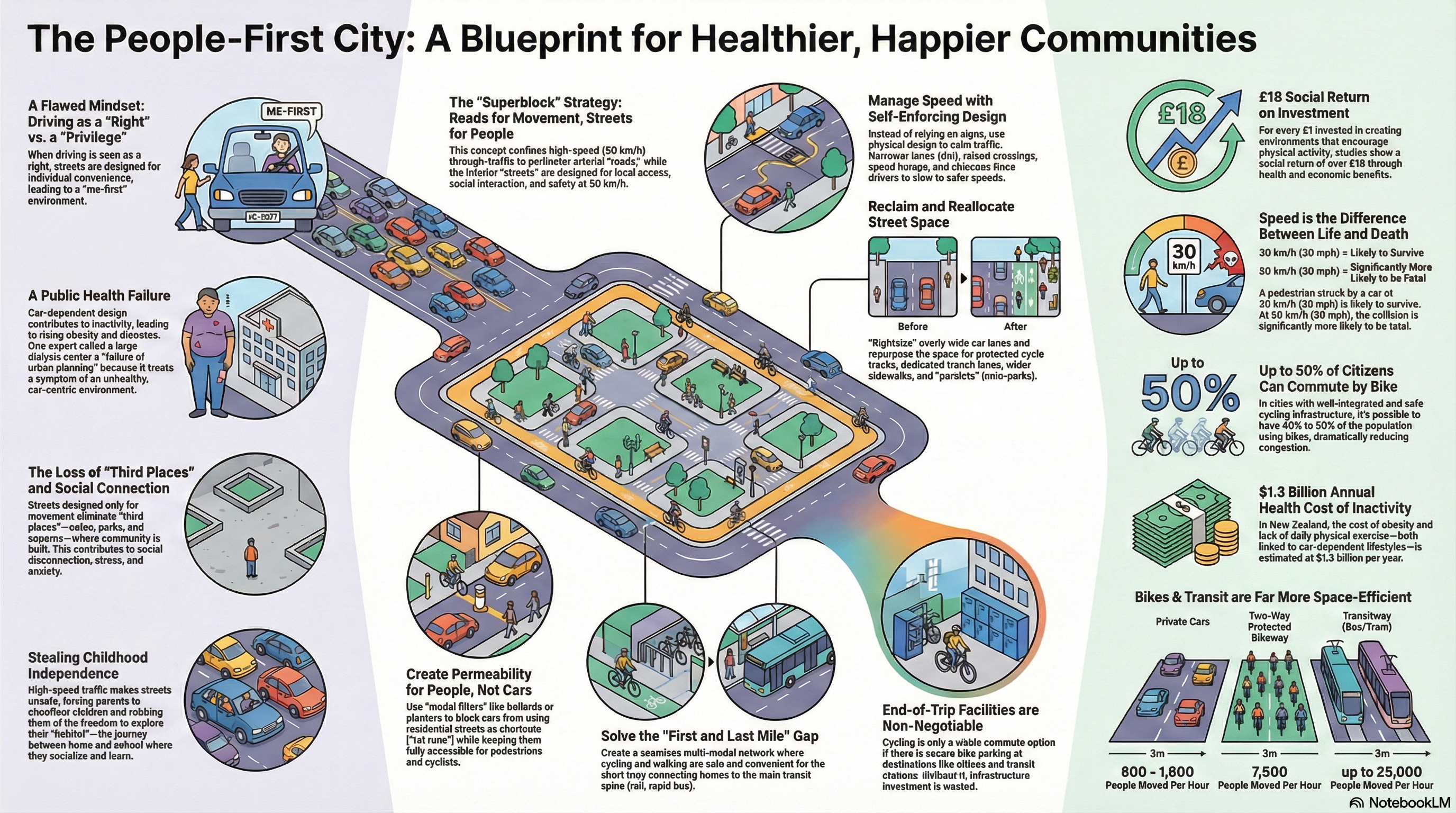 The argument is that decades of car-dependent urban design have engineered everyday physical activity out of our lives. When walking and cycling are inconvenient or dangerous, and every trip requires a car, we become more sedentary. This contributes directly to public health crises like obesity and diabetes, which disproportionately affect lower-income communities and communities of colour. This paradox reveals the deep, often invisible link between urban design, public health, and social equity. We are building the diseases we then spend billions of dollars to treat.