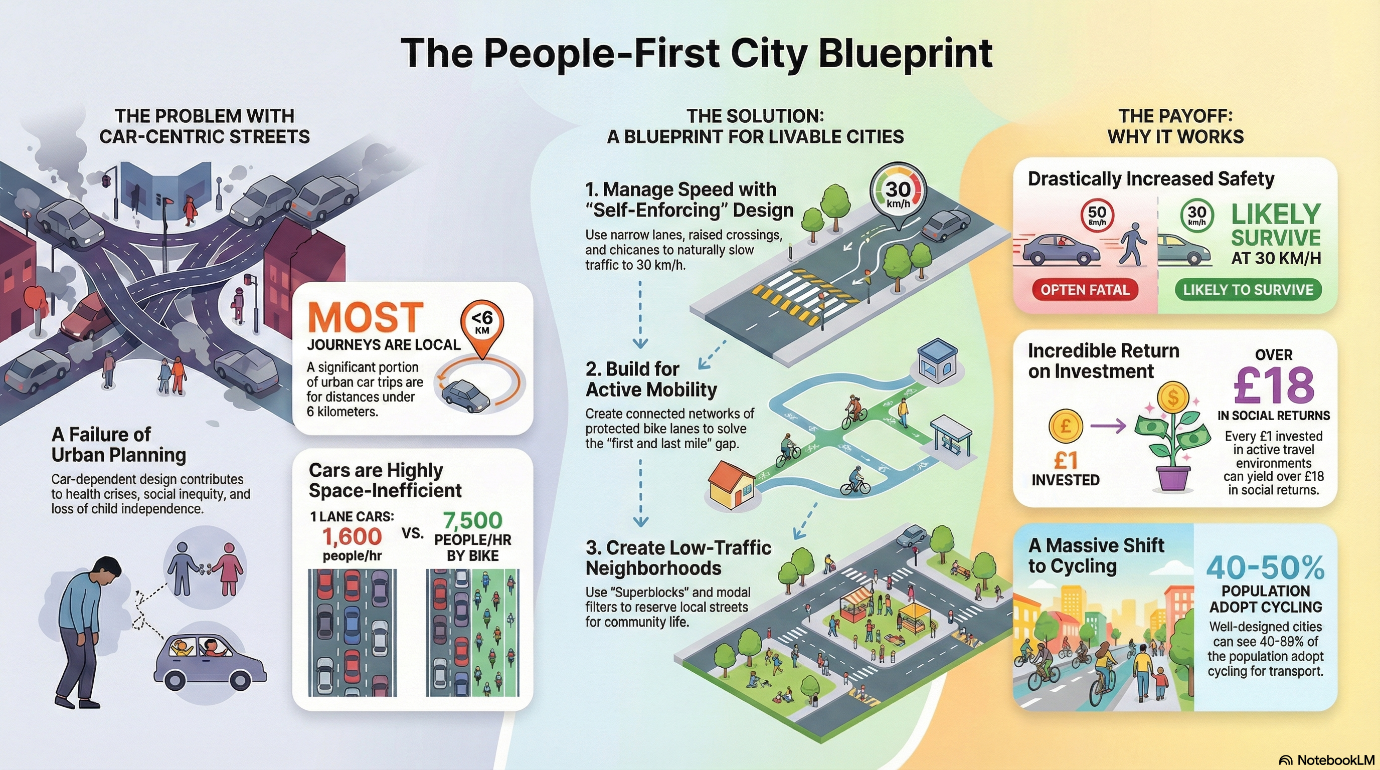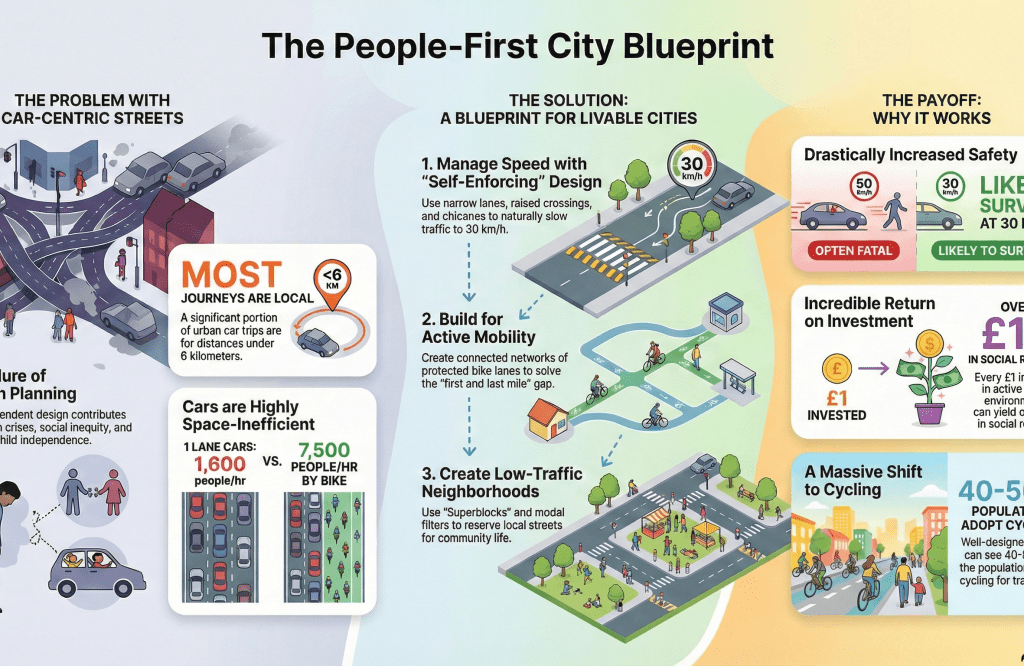 Look out your window at the street below. Chances are you see a landscape dominated by the movement, noise, and infrastructure of cars. Have you ever wondered why our cities are built this way? Why the default setting often seems hostile to pedestrians, cyclists, and community life? A different vision exists—one that puts people first.