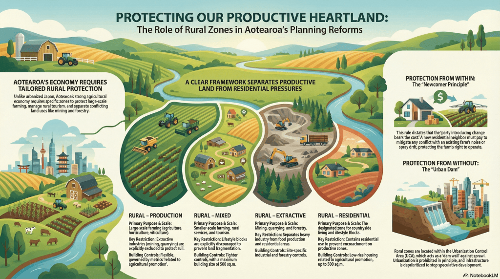 However, recognizing Aotearoa’s unique economic geography, the framework includes critical rural adaptations that are absent in the highly urbanized Japanese model. These specialized rural zones are designed to protect our primary industries: