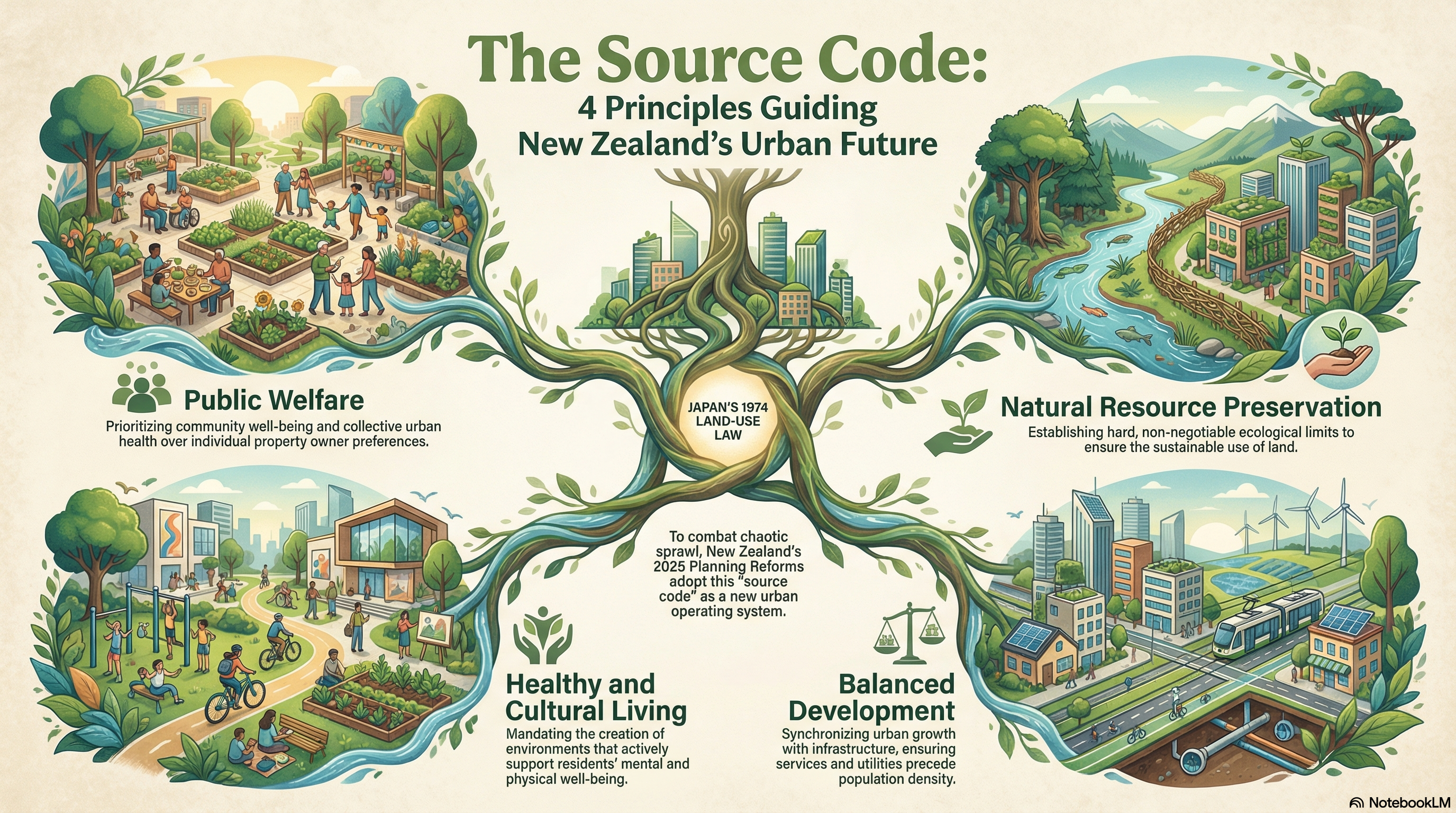 This document serves as a strategic briefing on how the Aotearoa Planning Bill 2025 imports the structural “DNA” of Japan’s successful 1974 Land-Use Law. The goal is to install a resilient “urban operating system” capable of managing growth, enhancing environmental quality, and providing the legal certainty required for national progress. The philosophical core of this new system is built upon four foundational principles that shift the focus from individual property preferences to the long-term well-being of the collective habitat.
