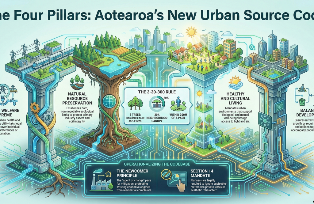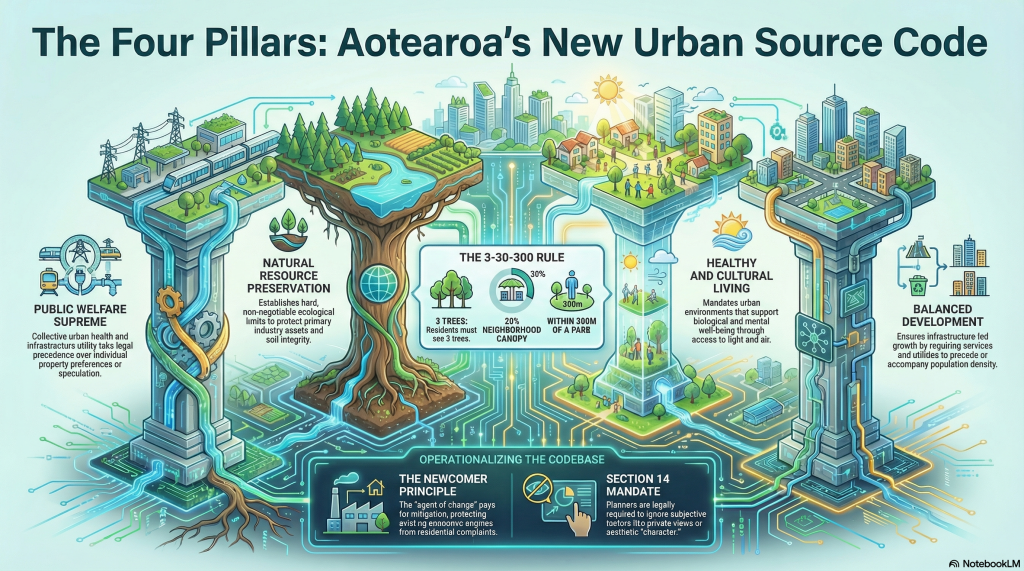 The “Four Pillars of Public Welfare” function as the ethical and legal “Source Code” of my Aotearoa Planning Bill 2025 submission. Adopted directly from Japan’s 1974 Land-Use Law, these principles are designed to solve the “crisis of chaos” (speculation and sprawl) by legally prioritizing collective needs over individual property rights.