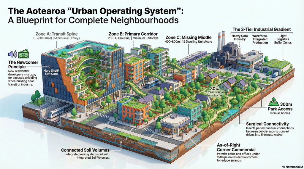For decades, our cities have been designed as “dormitory suburbs”—monolithic zones that function merely as storage for people and cars. This legacy of “artificial distance” has crippled our collective metabolic rate, forcing us into a state of negative productivity where hours are lost to the friction of traffic and rigid zoning. The Aotearoa Planning Bill 2025 represents a clean break from this failed model. It signals the transition from the subjective “nitpicking trap” of mid-century aesthetics to a systemic “Culture of Adherence.”