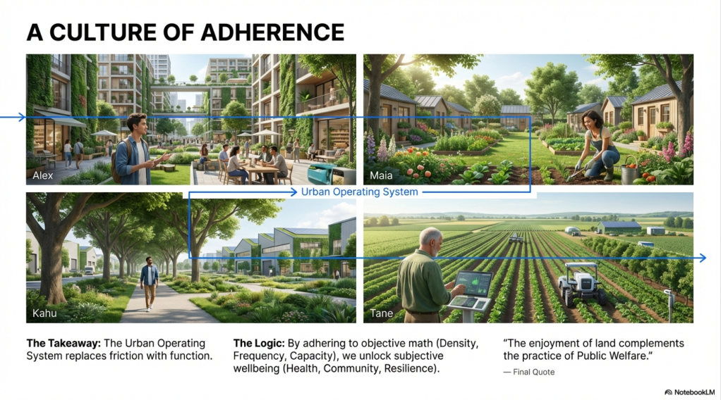 So, to assist moving beyond abstract legal definitions of the Aotearoa Planning Bill 2025 (the Submission), the submission utilised four distinct “User Stories” to demonstrate how the new Urban Operating System functions in daily life. These characters represent the specific zones within the system—from the high-density core to the protected rural hinterland—showing how a “Culture of Adherence” replaces friction with function. These characters continue their story into the Design-Led Placemaking manual. Introducing Maia, Tane, Kahu and Alex.