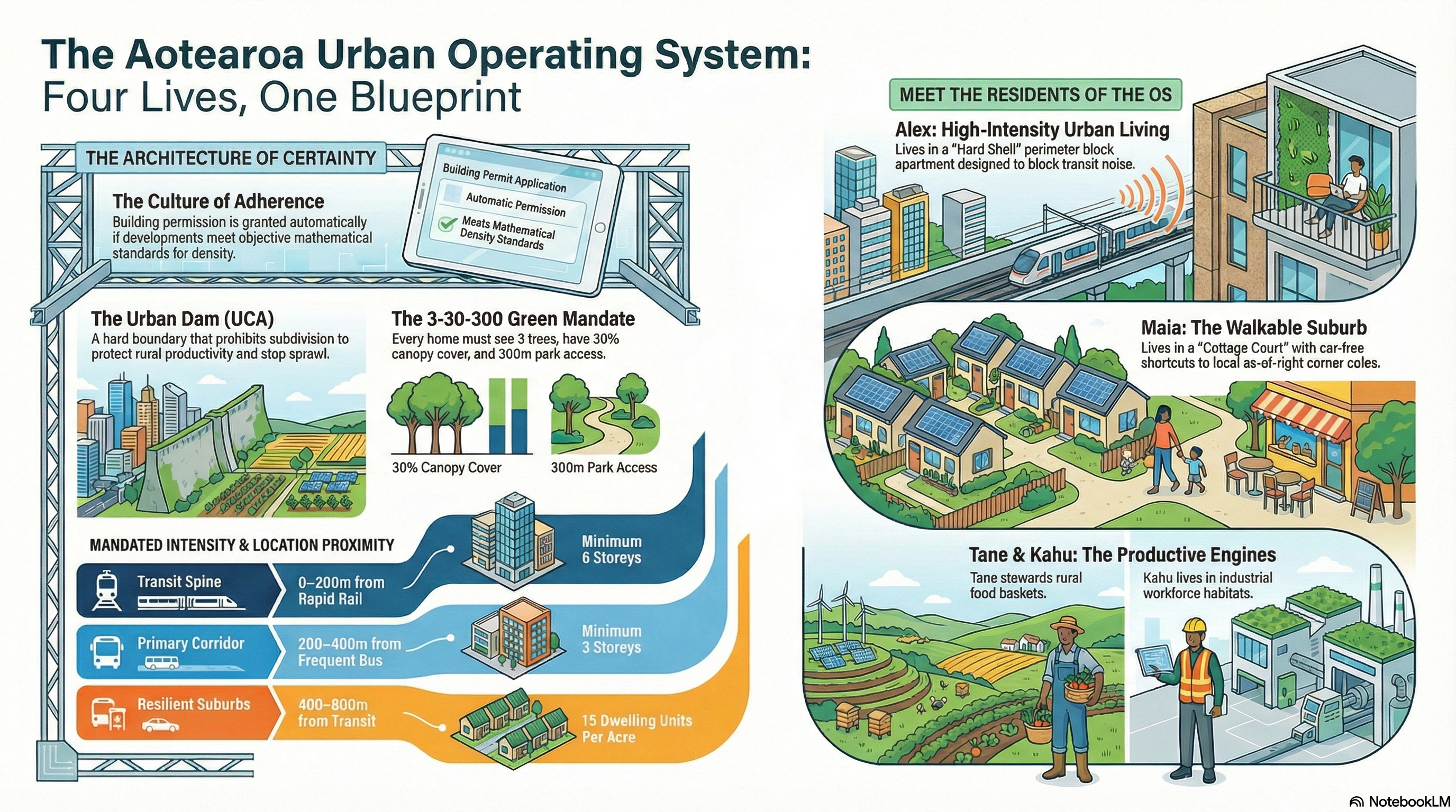 So, to assist moving beyond abstract legal definitions of the Aotearoa Planning Bill 2025 (the Submission), the submission utilised four distinct “User Stories” to demonstrate how the new Urban Operating System functions in daily life. These characters represent the specific zones within the system—from the high-density core to the protected rural hinterland—showing how a “Culture of Adherence” replaces friction with function. These characters continue their story into the Design-Led Placemaking manual. Introducing Maia, Tane, Kahu and Alex.