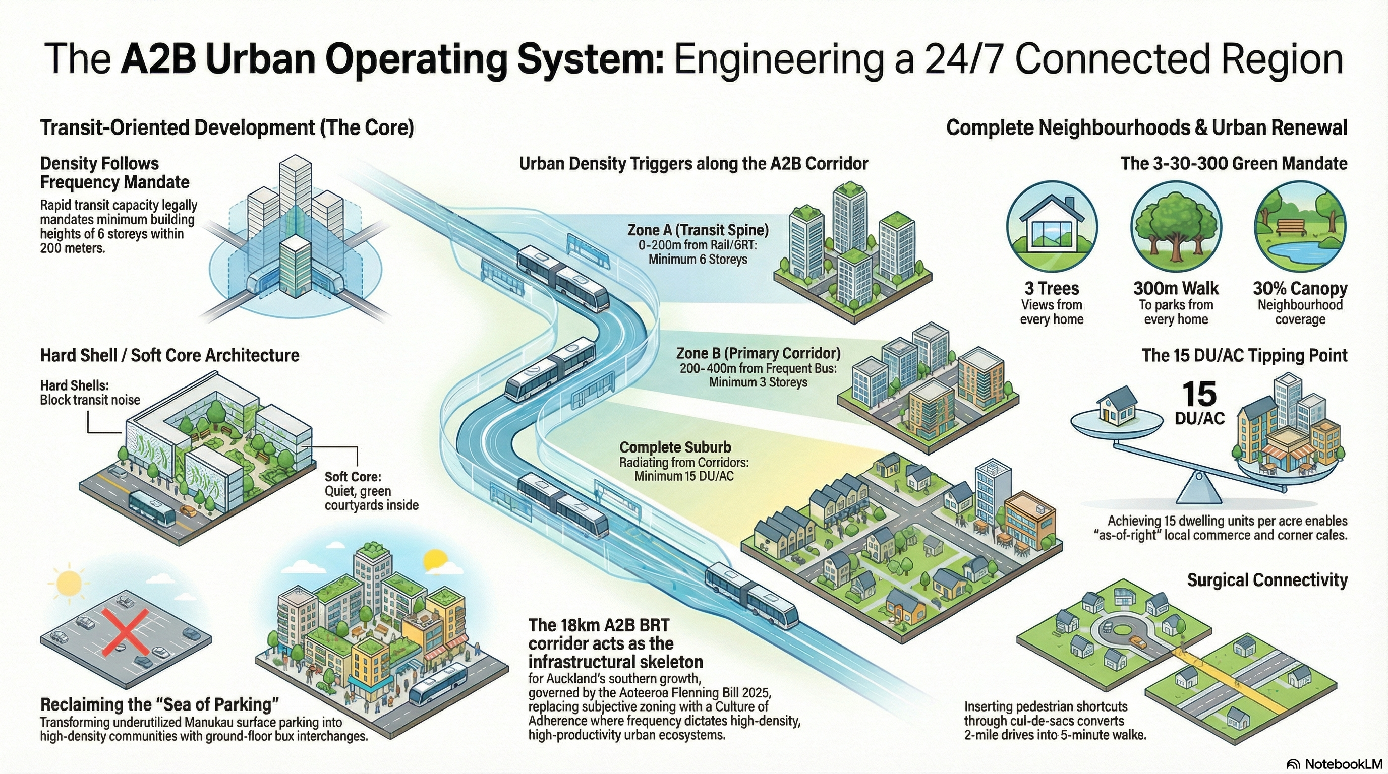 The Airport to Botany (A2B) Bus Rapid Transit is a dedicated, 18-kilometer congestion-free corridor connecting Auckland International Airport, Puhinui Station, Manukau City Centre, and Botany. Beyond simply moving passengers, the A2B serves as the foundational “infrastructural skeleton” for a new Urban Operating System governed by the Aotearoa Planning Bill 2025. By replacing subjective planning with a mathematical “Culture of Adherence,” the A2B acts as a catalyst for high-density, high-productivity urban growth.
