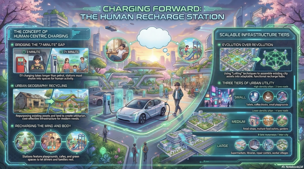 The success of sustainable transit depends on more than battery density; it depends on human comfort. By adopting the philosophy of Urban Geography Recycling, we can transform the “7-minute itch” of EV charging into an opportunity for rest, recreation, and community utility.