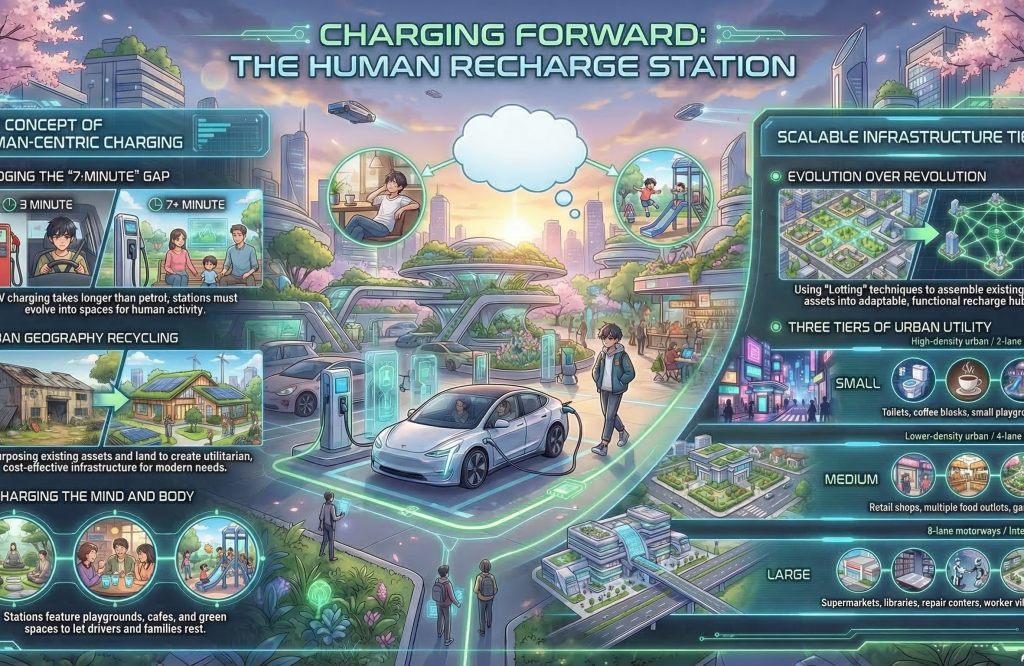 The success of sustainable transit depends on more than battery density; it depends on human comfort. By adopting the philosophy of Urban Geography Recycling, we can transform the “7-minute itch” of EV charging into an opportunity for rest, recreation, and community utility.